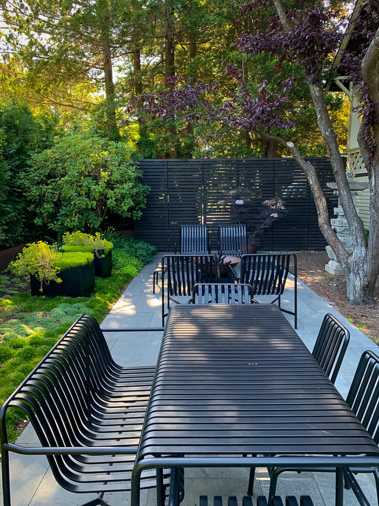 The Dunbar garden sits on an exposed corner lot in a Vancouver residential neighbourhood. Tall cedar hedging meets a charcoal-stained cedar privacy screen, creating a private garden terrace. The division of the screen into equal panels allows the gate to disappear visually when closed. Soft ground cover planting and garden sculptures create a sense of tranquility.