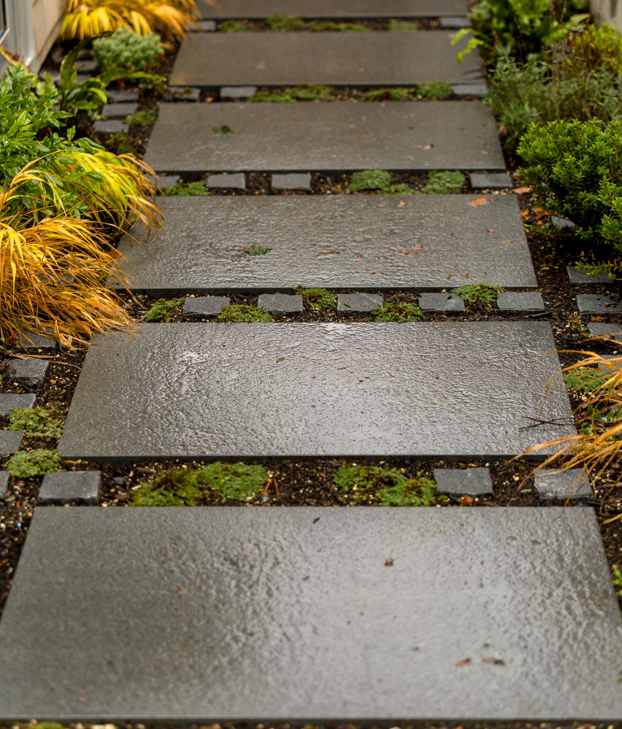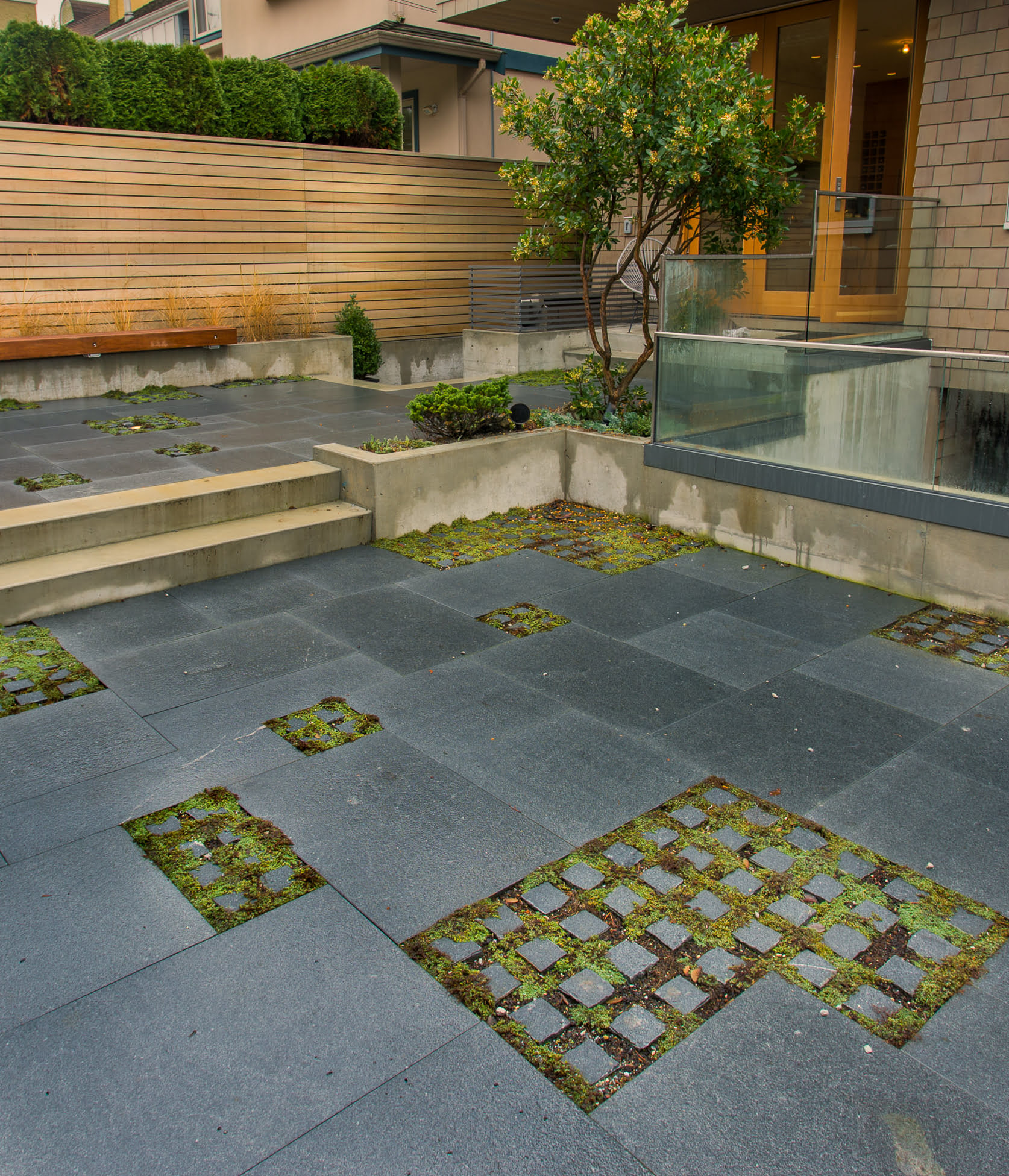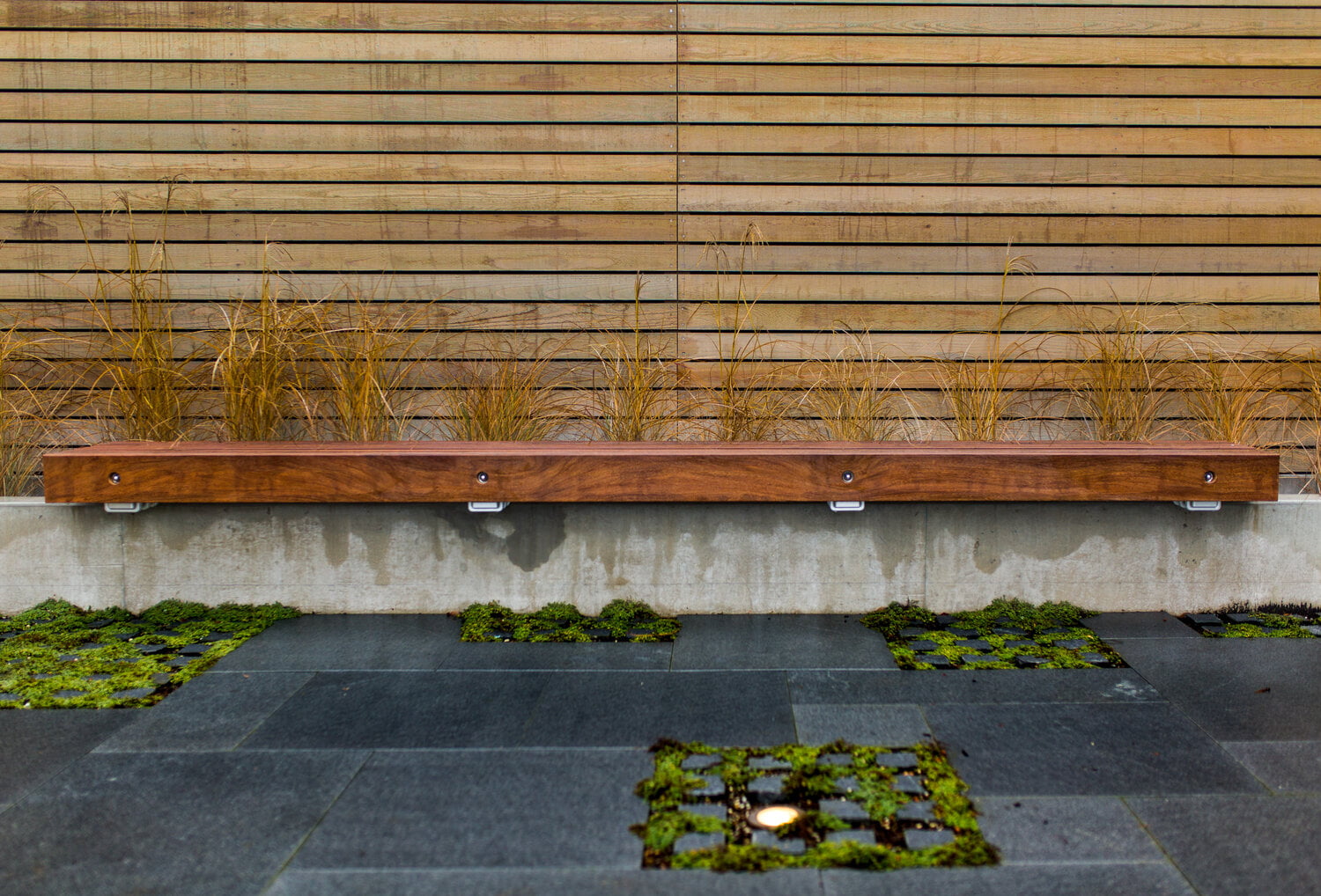 This contemporary urban garden was a collaborative effort concieved by Rose & Pistols garden design. A generous natural stone terrace is broken up by textural elements of cobblestone and ground cover. Clean architectural stairs and retaining walls define and divide the space, and provide seating by means of a built-in Ipe wood bench.