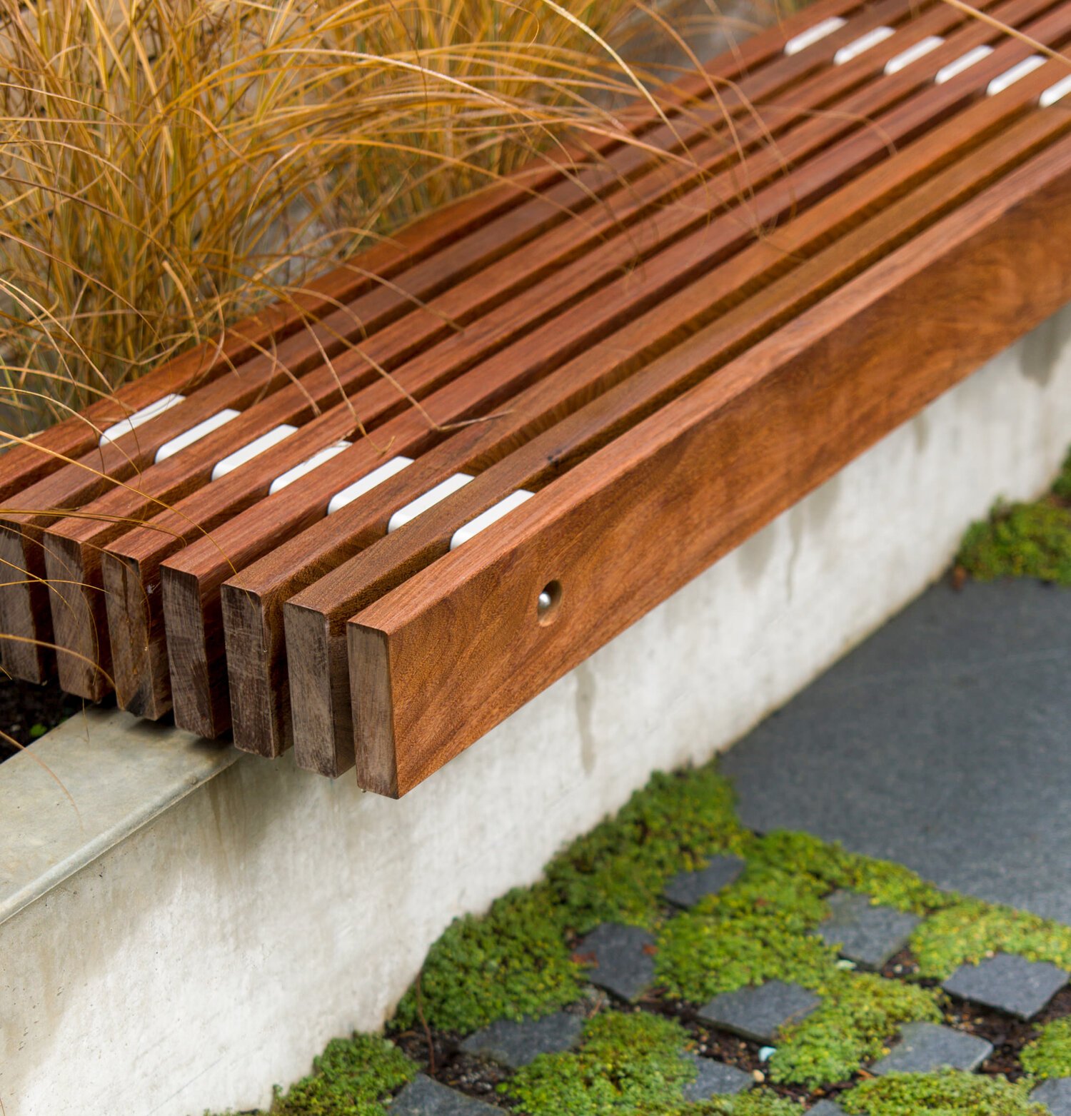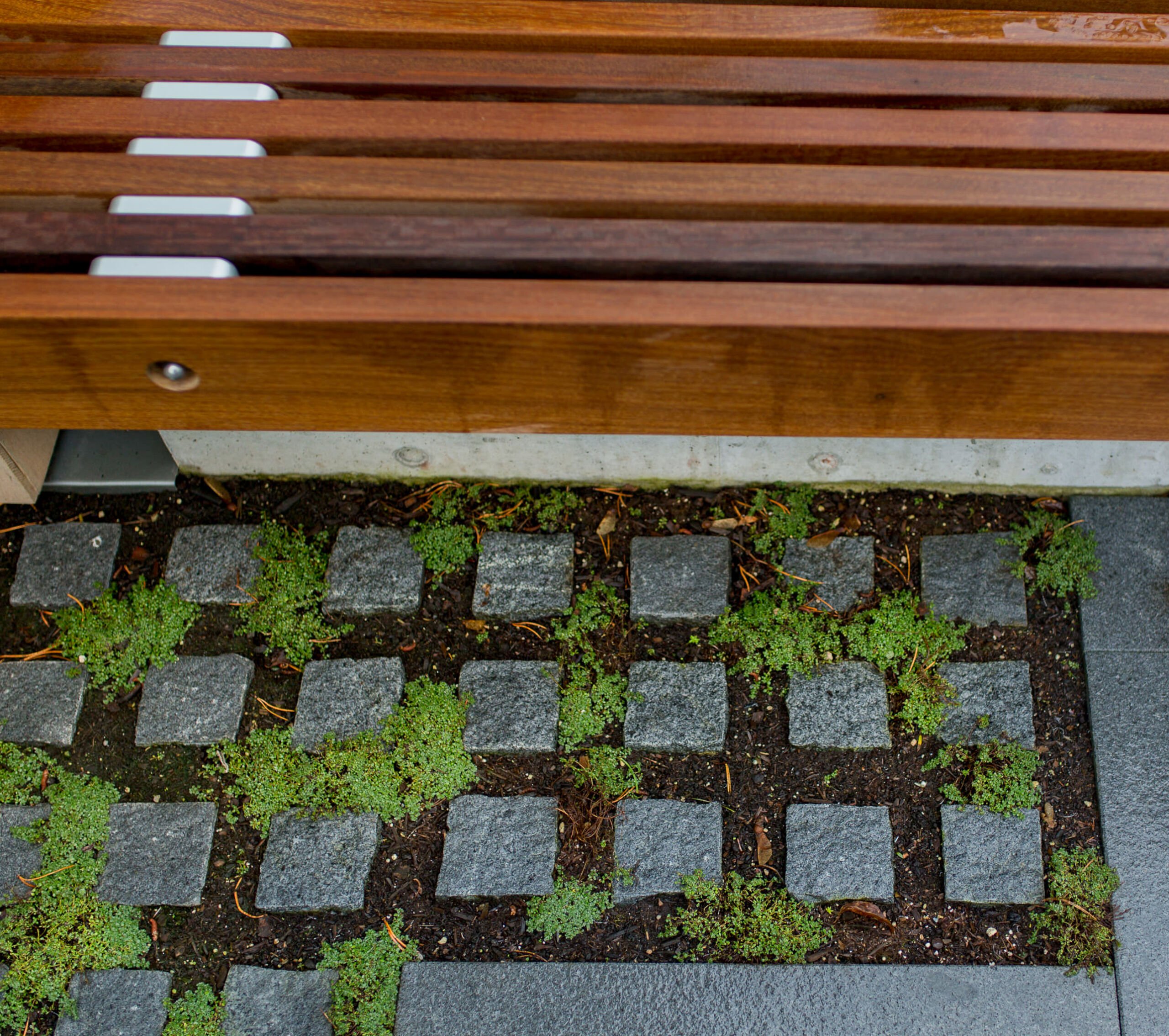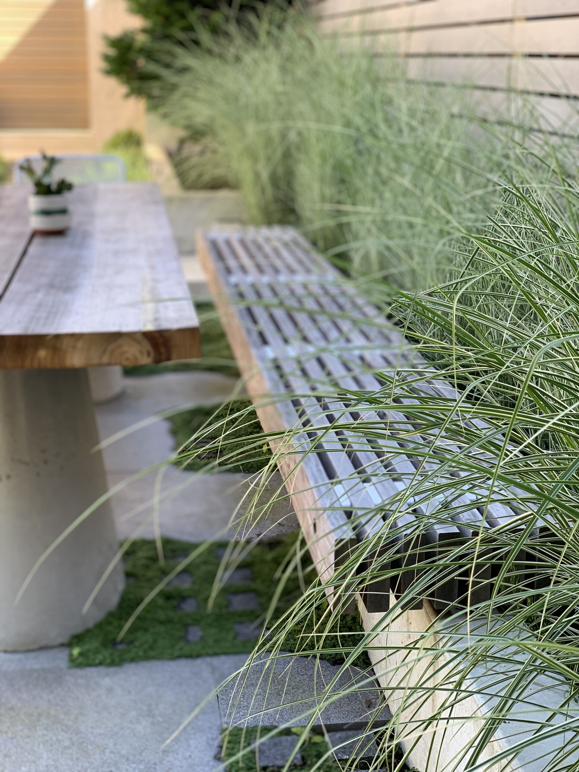 This contemporary urban garden was a collaborative effort concieved by Rose & Pistols garden design. A generous natural stone terrace is broken up by textural elements of cobblestone and ground cover. Clean architectural stairs and retaining walls define and divide the space, and provide seating by means of a built-in Ipe wood bench.