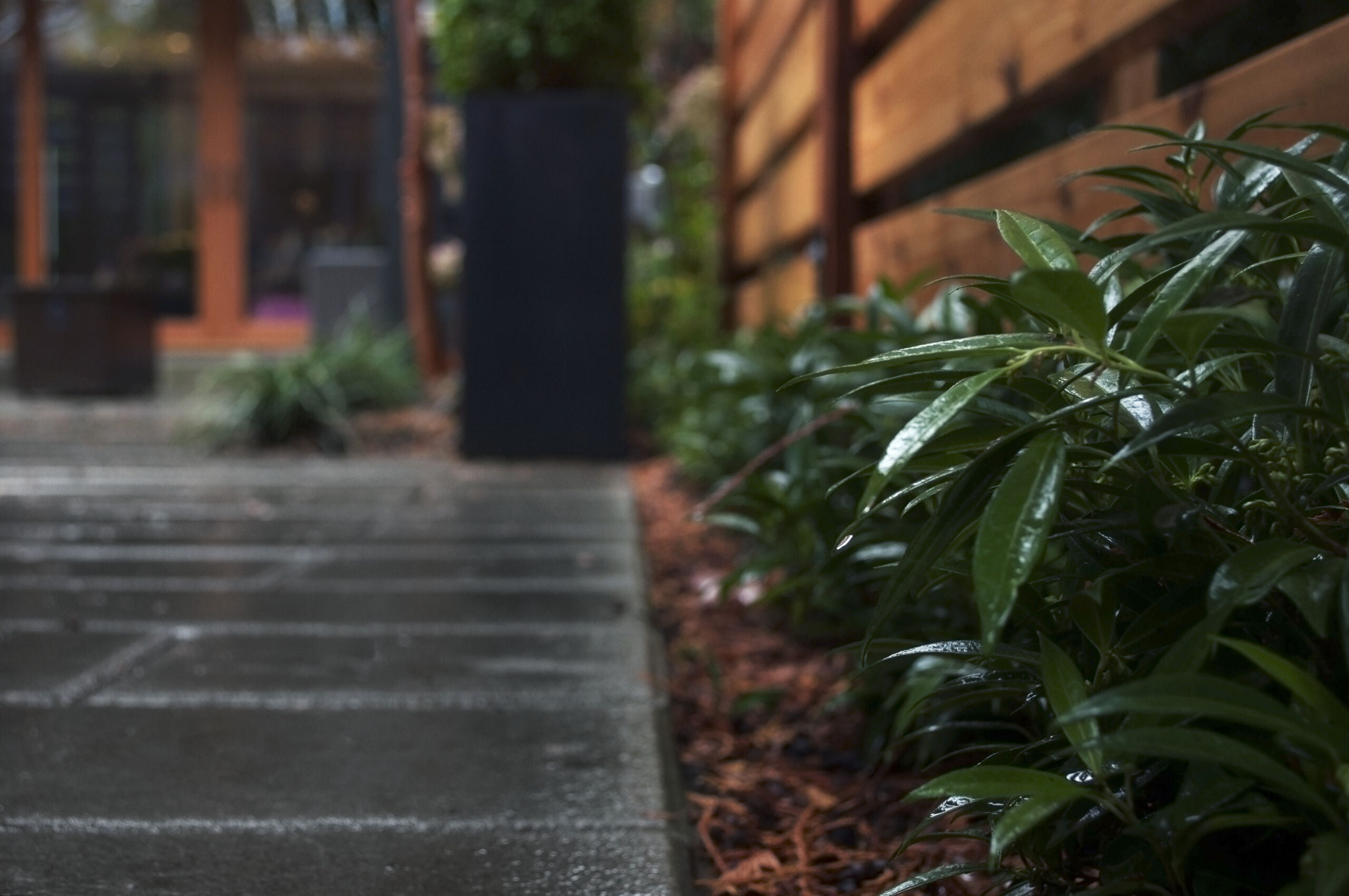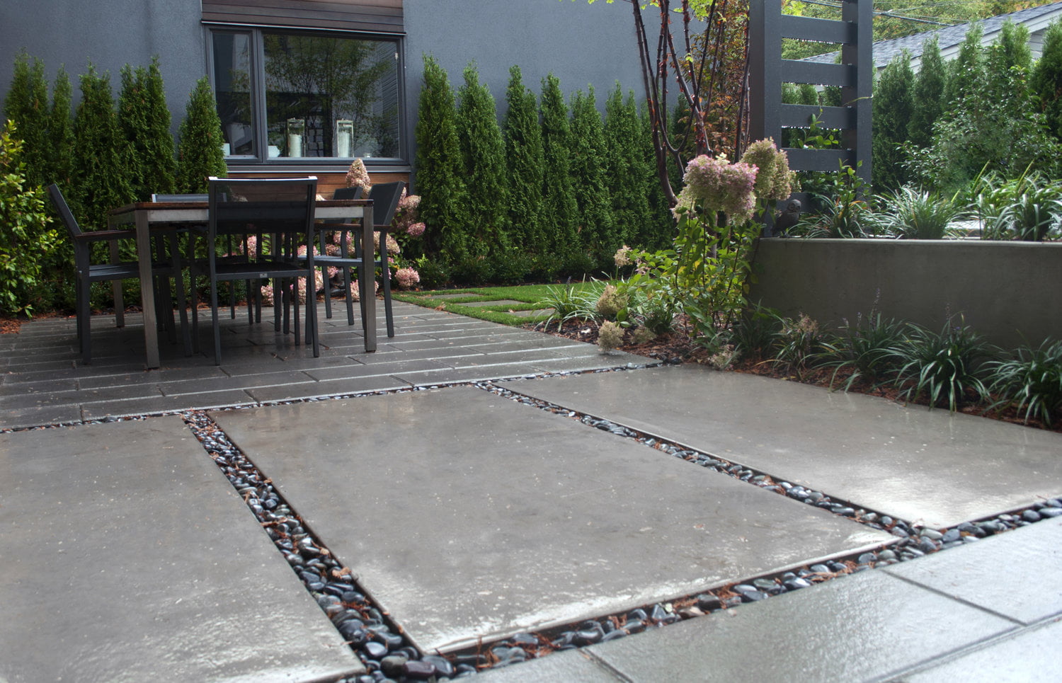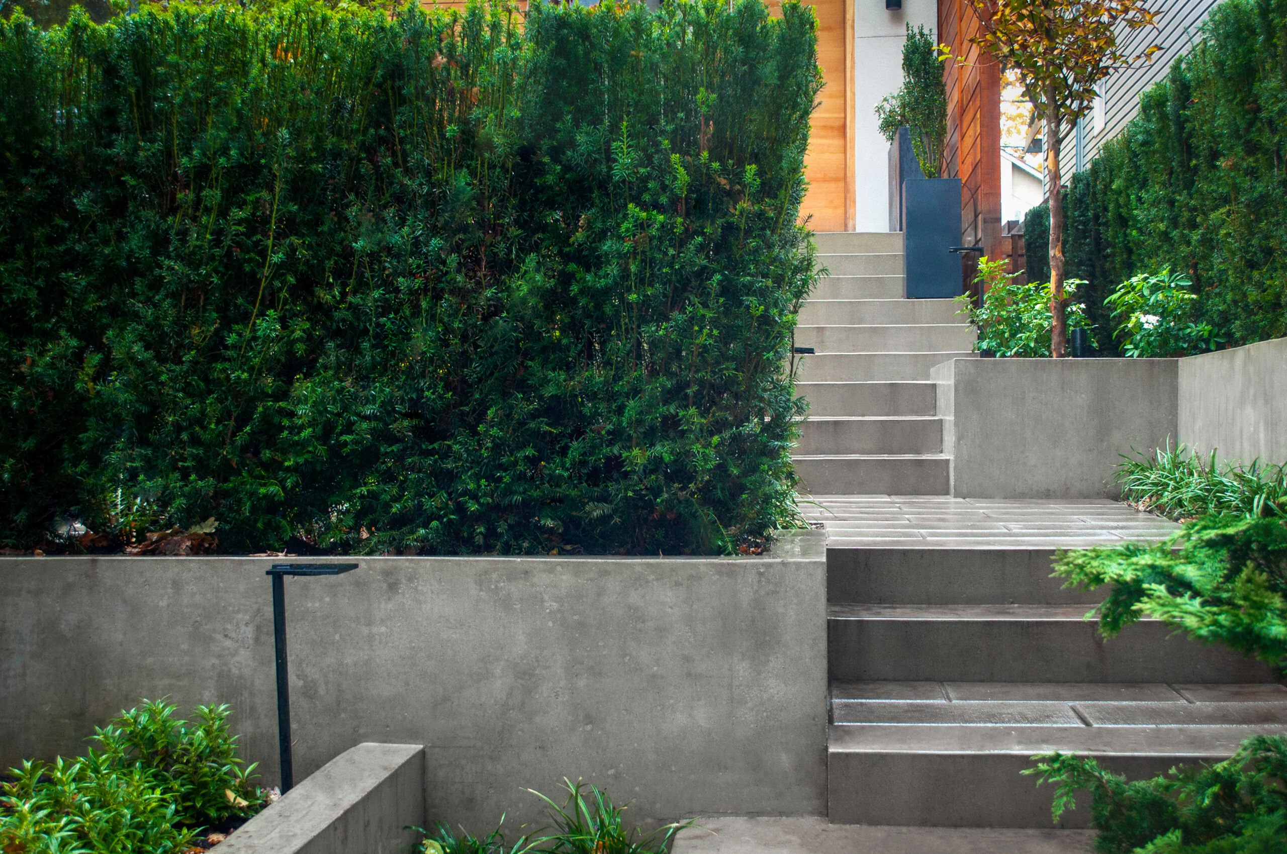 This collaborative project was conceived by garden designer John Minty, and built in by the 161 team. Architectural concrete is featured throughout the property and complimented by strong elements of Cedar privacy screening. The small rear-yard space is highly functional and includes a covered BBQ area, outdoor dining table, fire-pit and hot tub. Completed in 2016, Vancouver BC.